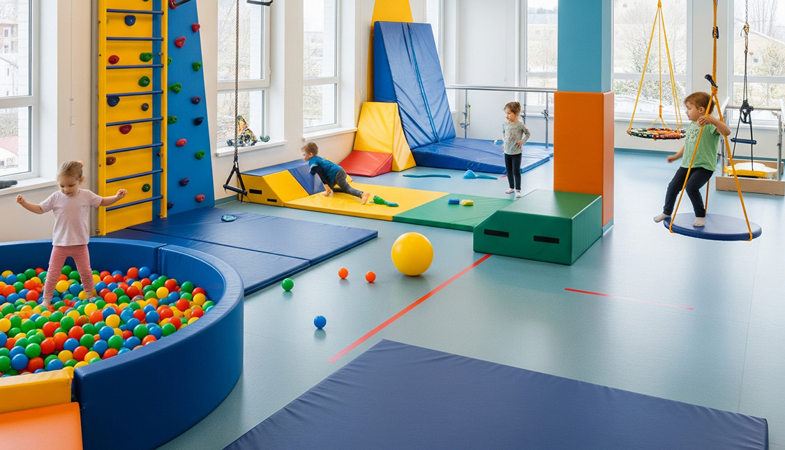 Sala de integración sensorial con columpios, piscina de bolas y rocódromo.